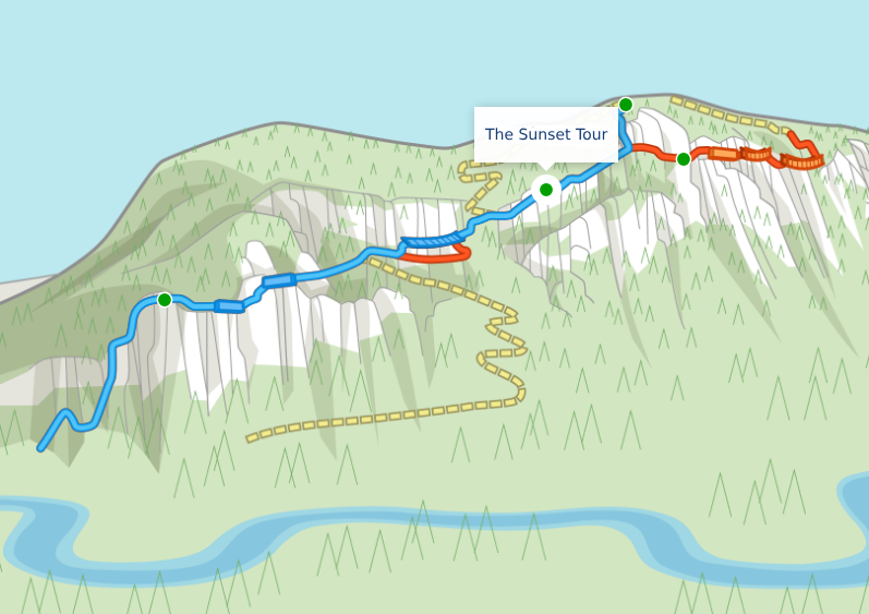 800 metres long (green plus orange routes below), our Via Ferrata – Sunset Tour takes approximately 5 hours including a 1h15 walk back to the departure point. On this Via Ferrata mountain trip, you will climb to the highest point of the Vache Noir Mountain on a series of metal steps, log bridges and suspended bridges, just in time to watch the sun set over Mont-Tremblant and the Diable river. You will head back down before dusk.