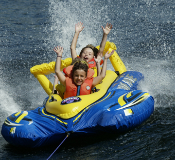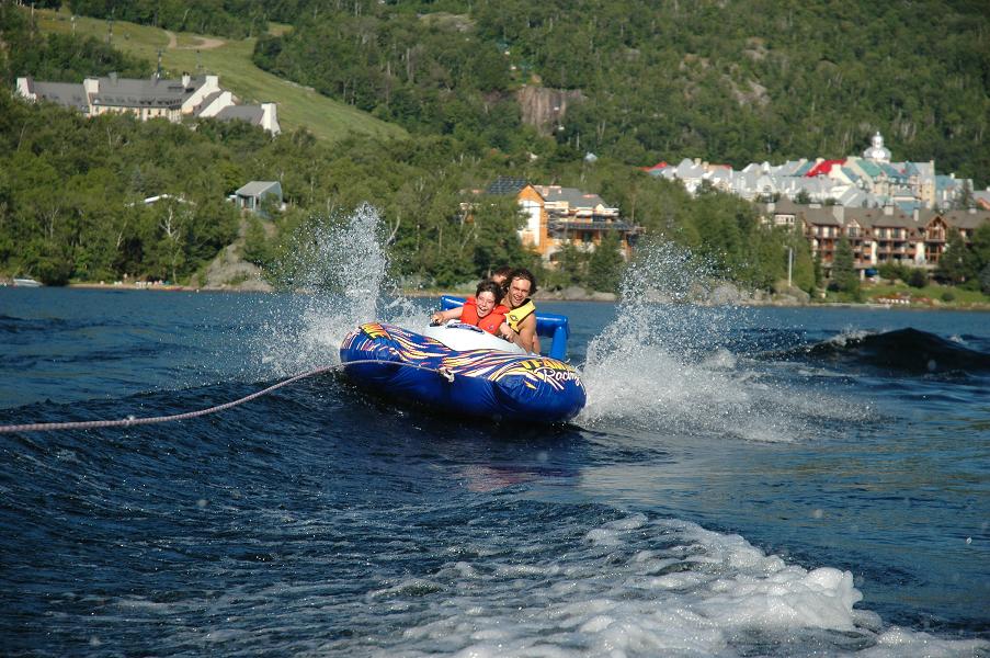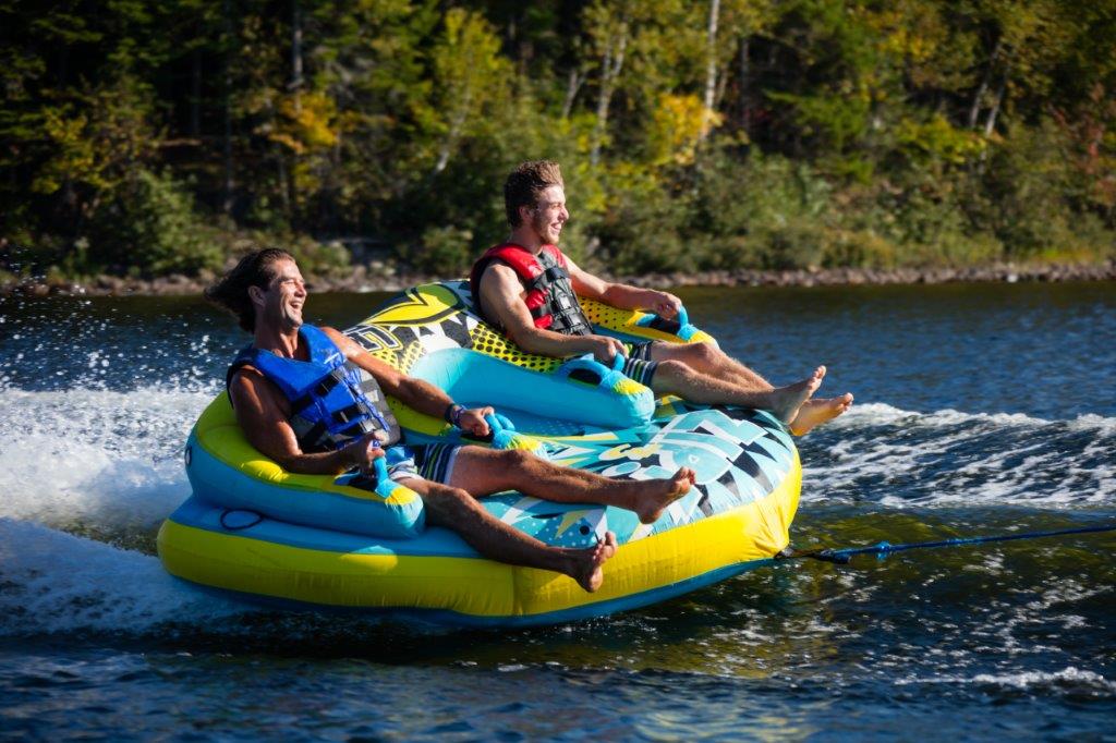 Tubing on Lake Tremblant is one of the fun outdoor activity that we offer during summer season! Our certified instructors have years of teaching experience and are always happy to share their passion for their sport. When you reserve for a tube rental or other watersport, all the equipment, plus the boat, captain, and our instructor are included. To get better waves, we have one boat for waterski and tubing and one boat for wakeboard and wakesurfing. If you choose tube and wakeboard or wakesurf, you might change boat during your activity. It is possible to change between waterskiing and tubing during the time of the activity. You choose the duration you want and it can be shared among your group.