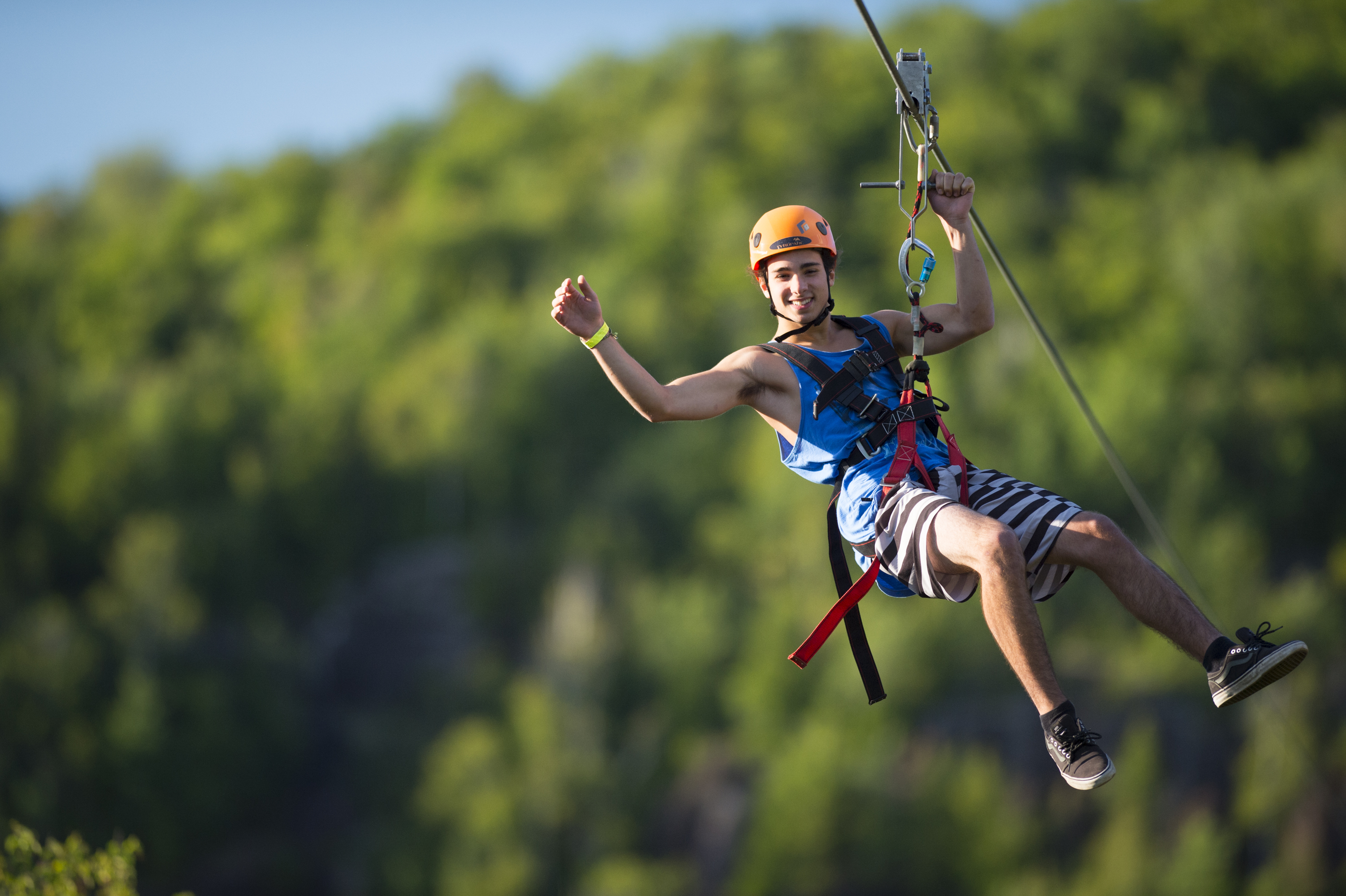 Starting from our reception building, you will do a short initiation on a rock wall before walking a short 10 min walk to reach the cliffs of Cap Beauséjour. This is the starting point for our Via Ferrata, a challenging rockface with built-in steps, hand and footholds. Along the 1968-foot (600m) route, while connected to the continuous life line (you are always connected to a steel cable), you will climb obstacles such as ladders, metal steps and handles, and cross bridges, tight ropes and even a chain swing between two sections as you ascend to a height of 196 feet (60 m), the equivalent of a 20-story building!Our Via Ferrata is 300m long. At the top, you can admire the view over Ste-Agathe-des-Monts. The next step, our first Mega Zipline of 3000 feet (900m), brings you to the other side of the mountain. Our second Zipline then takes you for a 2132-foot (650m) flight down to the foot of Cap Beauséjour. Our third and fourth ziplines are 2000 feet (610m) and 1500 feet (450m) and will take you all the way down the mountain.