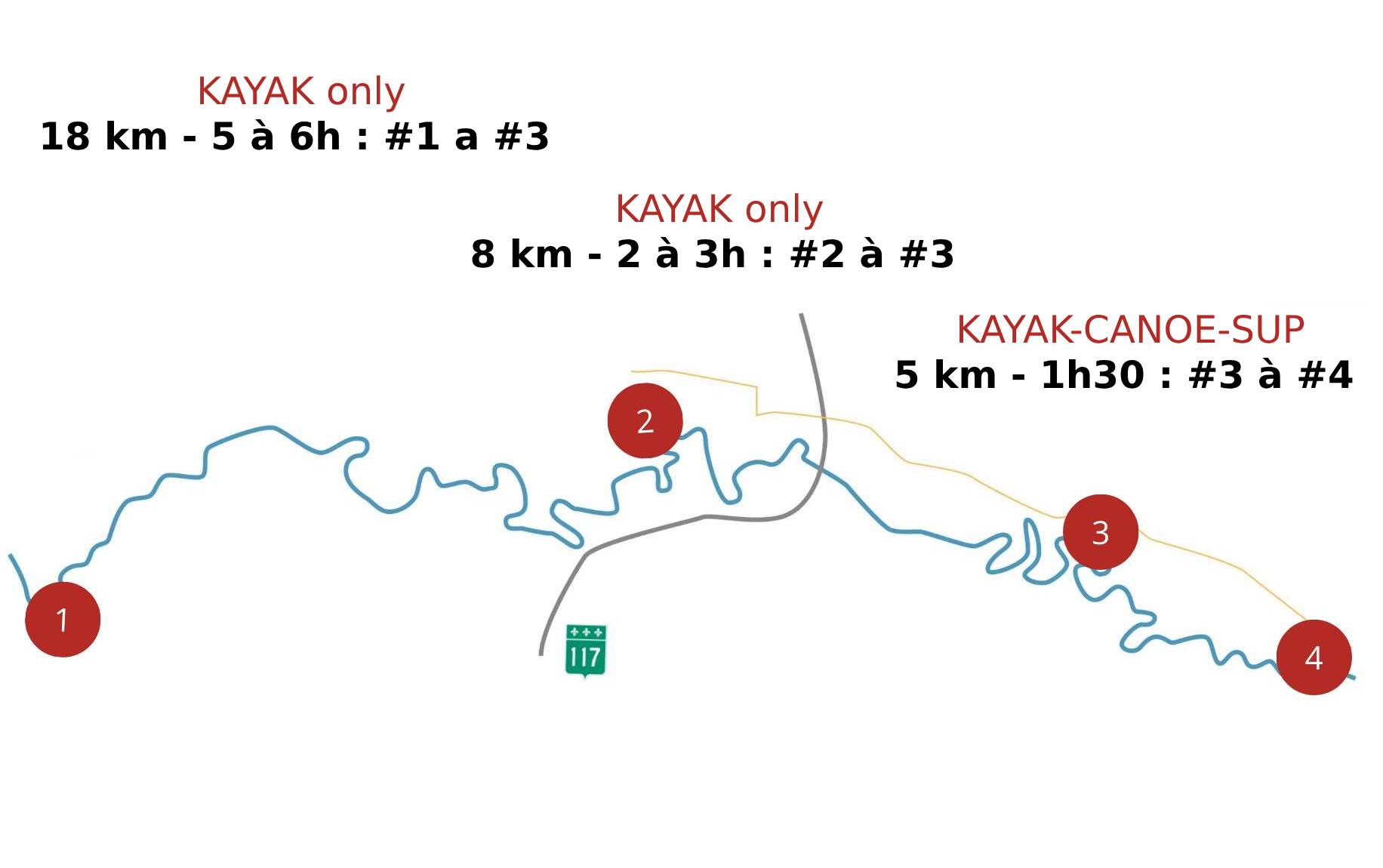 Ce forfait débute à notre quai sur la Rivière du Diable, après une courte marche de 5 minutes dans nos sentiers, et se termine 5 km plus loin, au point de rencontre pour la navette du retour qui vient vous chercher 2 heures après votre départ. Cela vous laisse amplement le temps de profiter de la rivière et de ses plages puisque le parcours peut être effectué en moins de 1 h 30 si vous pagayez sans arrêt.